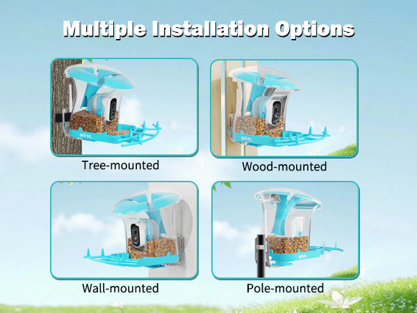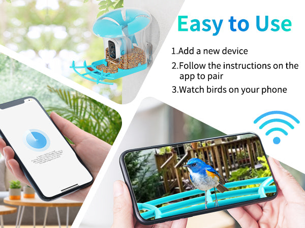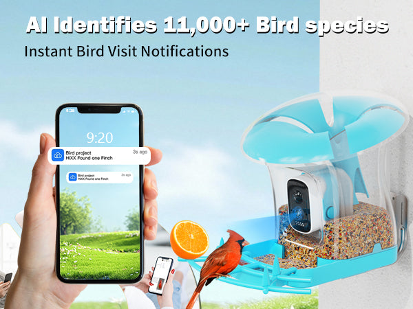Our smart bird feeder connects to your WiFi and streams real-time HD video to your phone. It automatically detects birds and identifies their species using AI.